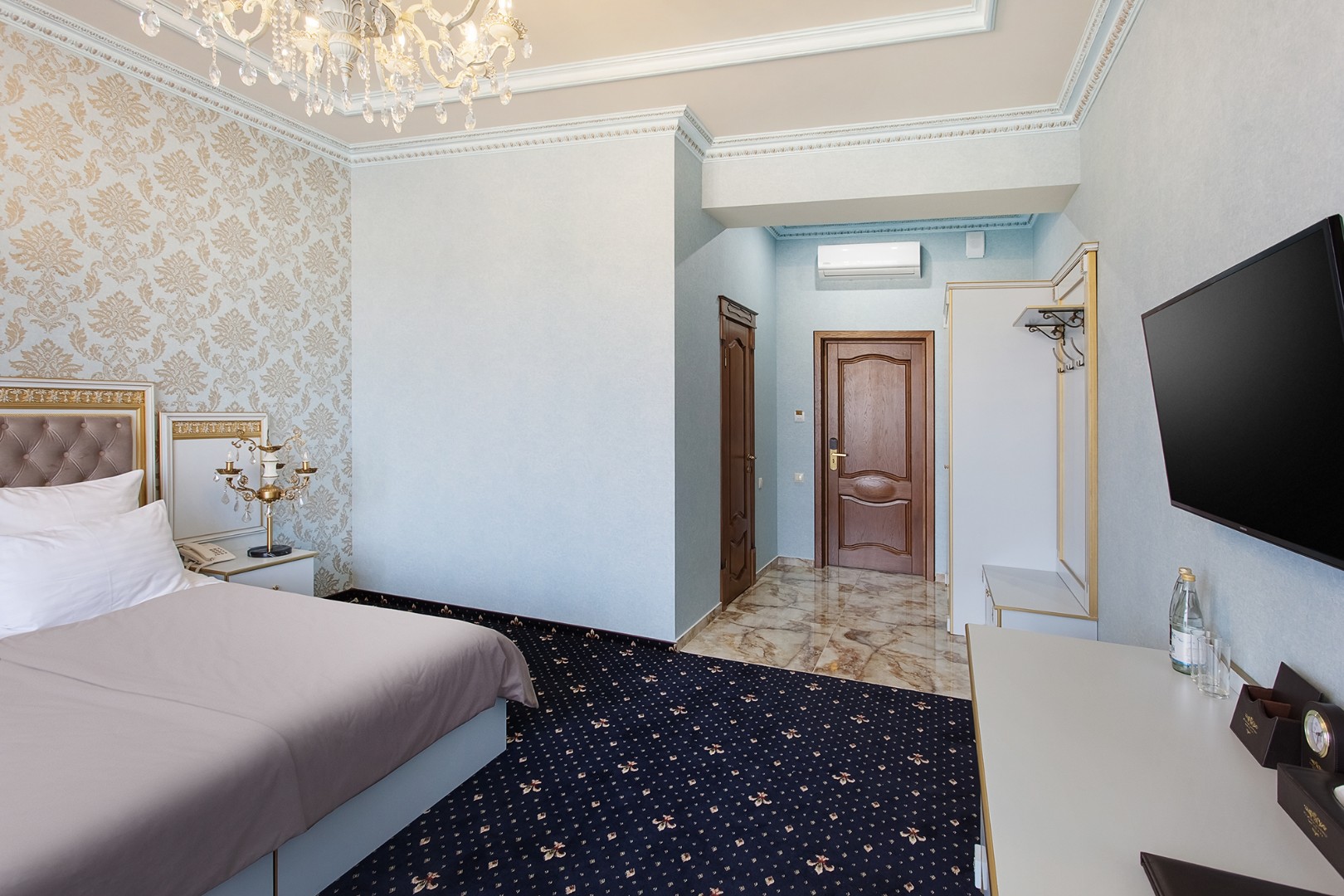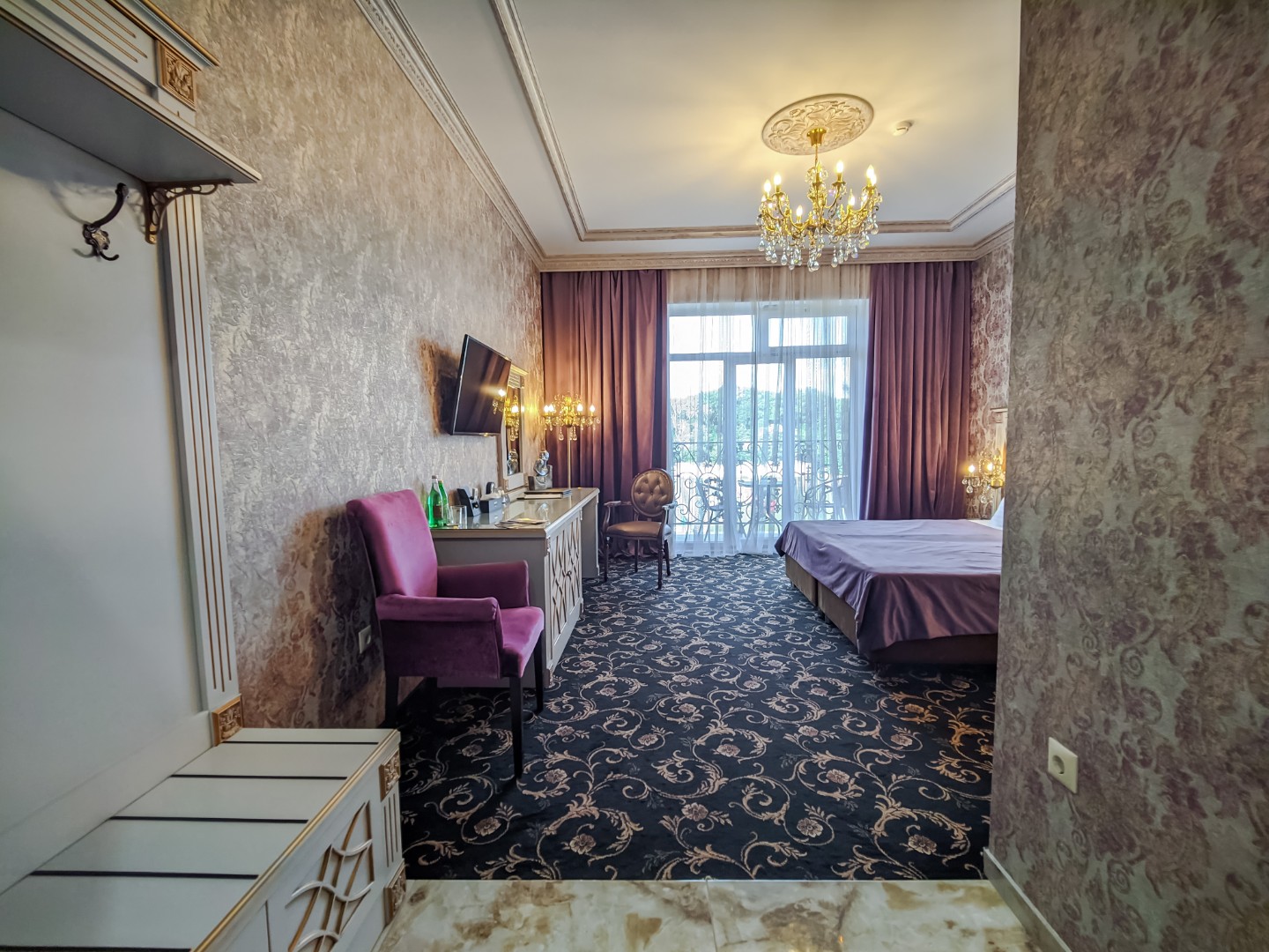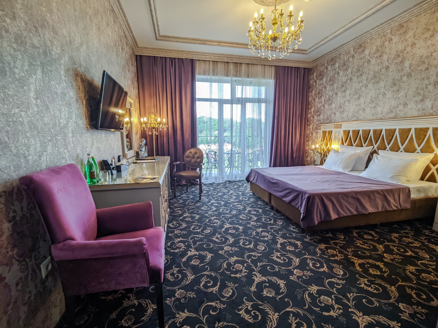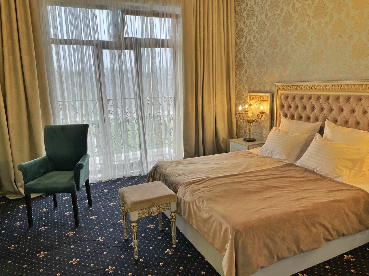 В номере: двуспальная кровать с размером «queen-size» с возможным разделением на 2 односпальные, прикроватные тумбы, светильники, торшер, туалетный столик и кресла, платяной шкаф, сейф, мини-бар, минеральная вода и вода без газа включенная в стоимость, кабельное ТВ, ЖК телевизор, Wi-Fi, кондиционер, необходимые принадлежности для ухода за верхней одеждой, гладильные принадлежности, балконы с прекрасным видом на футбольное поле и парковую зону, звукоизоляция.