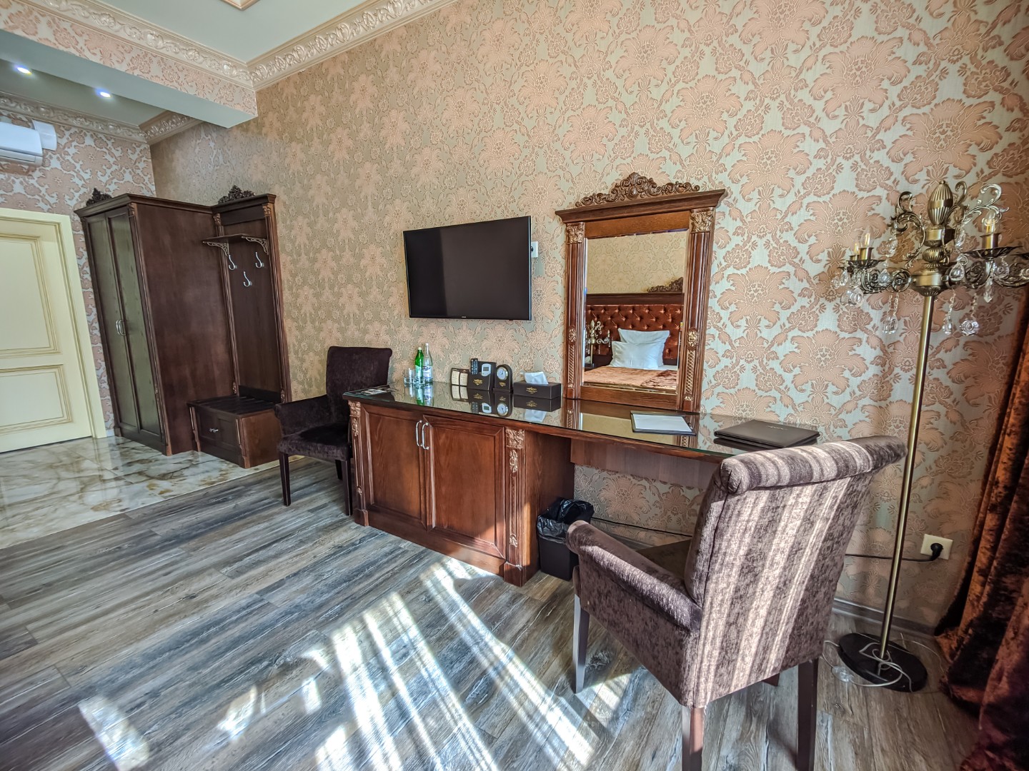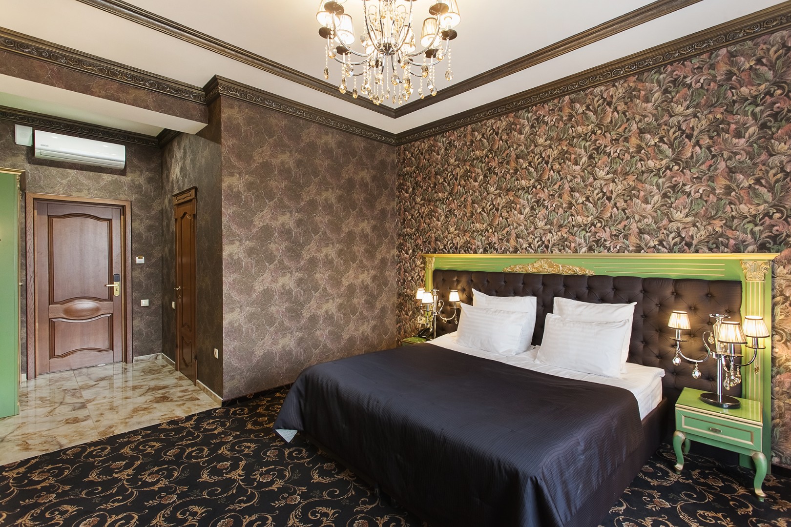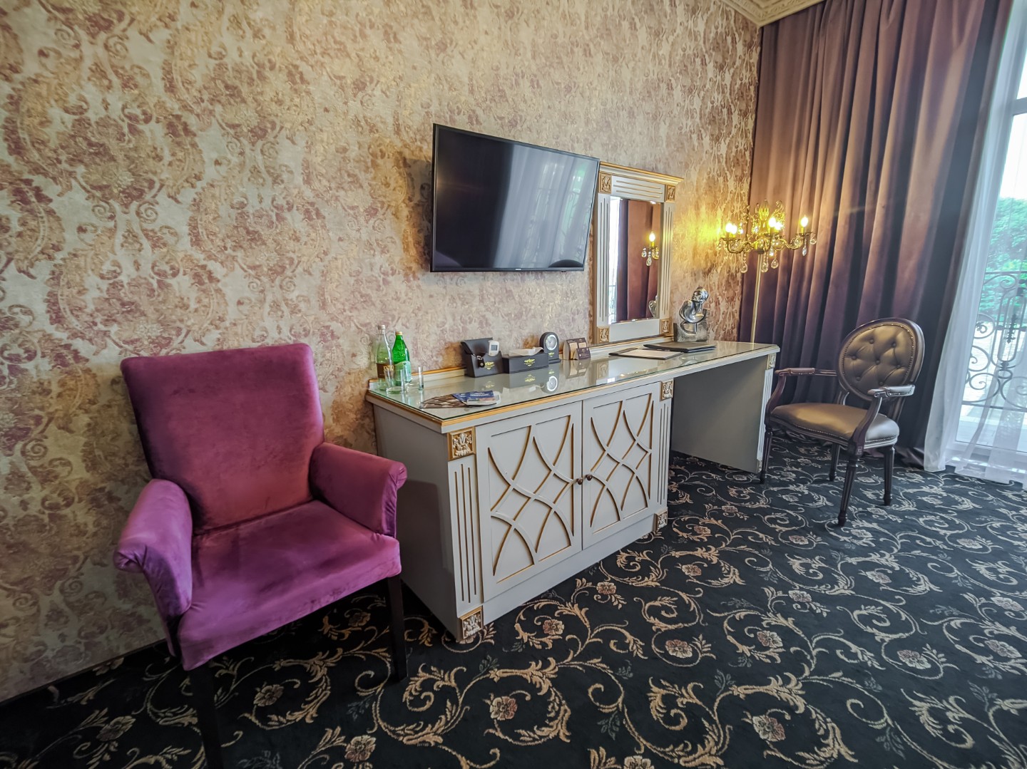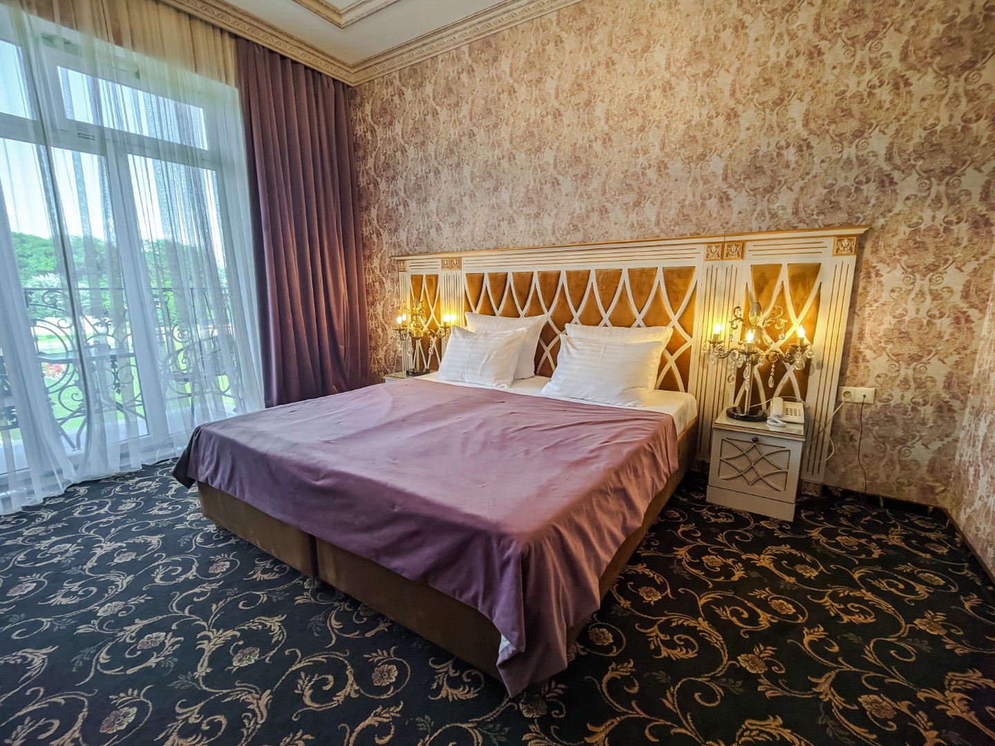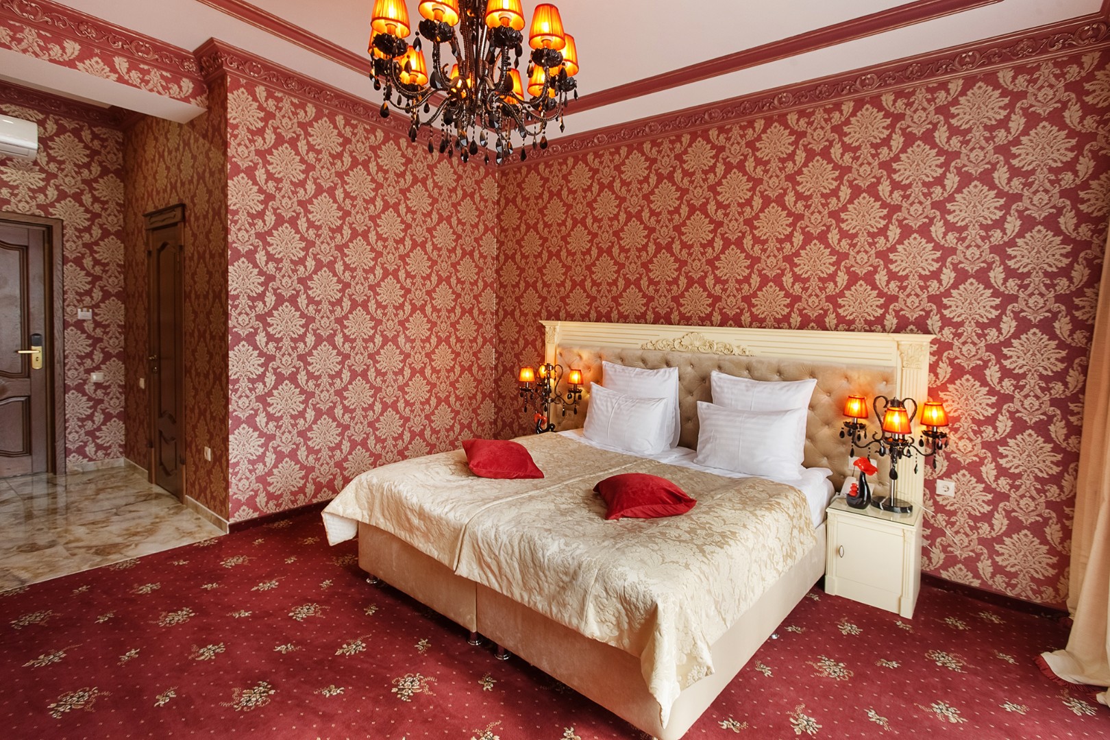 В номере: двуспальная кровать с размером «queen-size» с возможным разделением на 2 односпальные, прикроватные тумбы, светильники, торшер, туалетный столик и кресла, платяной шкаф, сейф, мини-бар, минеральная вода и вода без газа включенная в стоимость, кабельное ТВ, ЖК телевизор, Wi-Fi, кондиционер, необходимые принадлежности для ухода за верхней одеждой, гладильные принадлежности, балконы с прекрасным видом на футбольное поле и парковую зону, звукоизоляция.