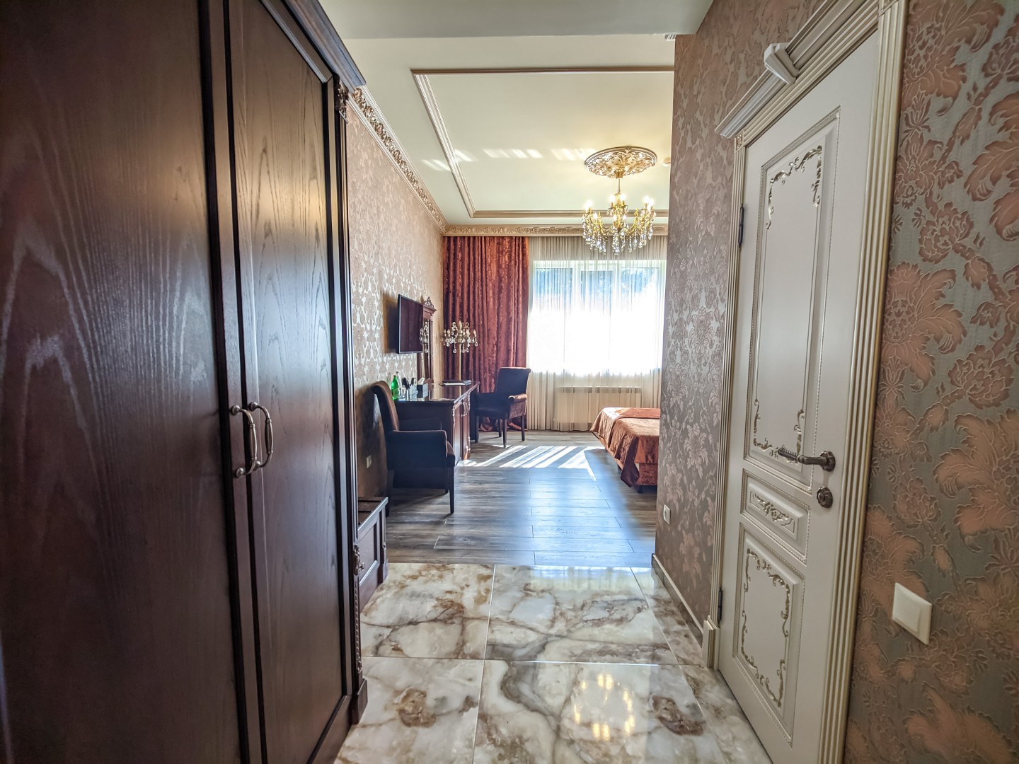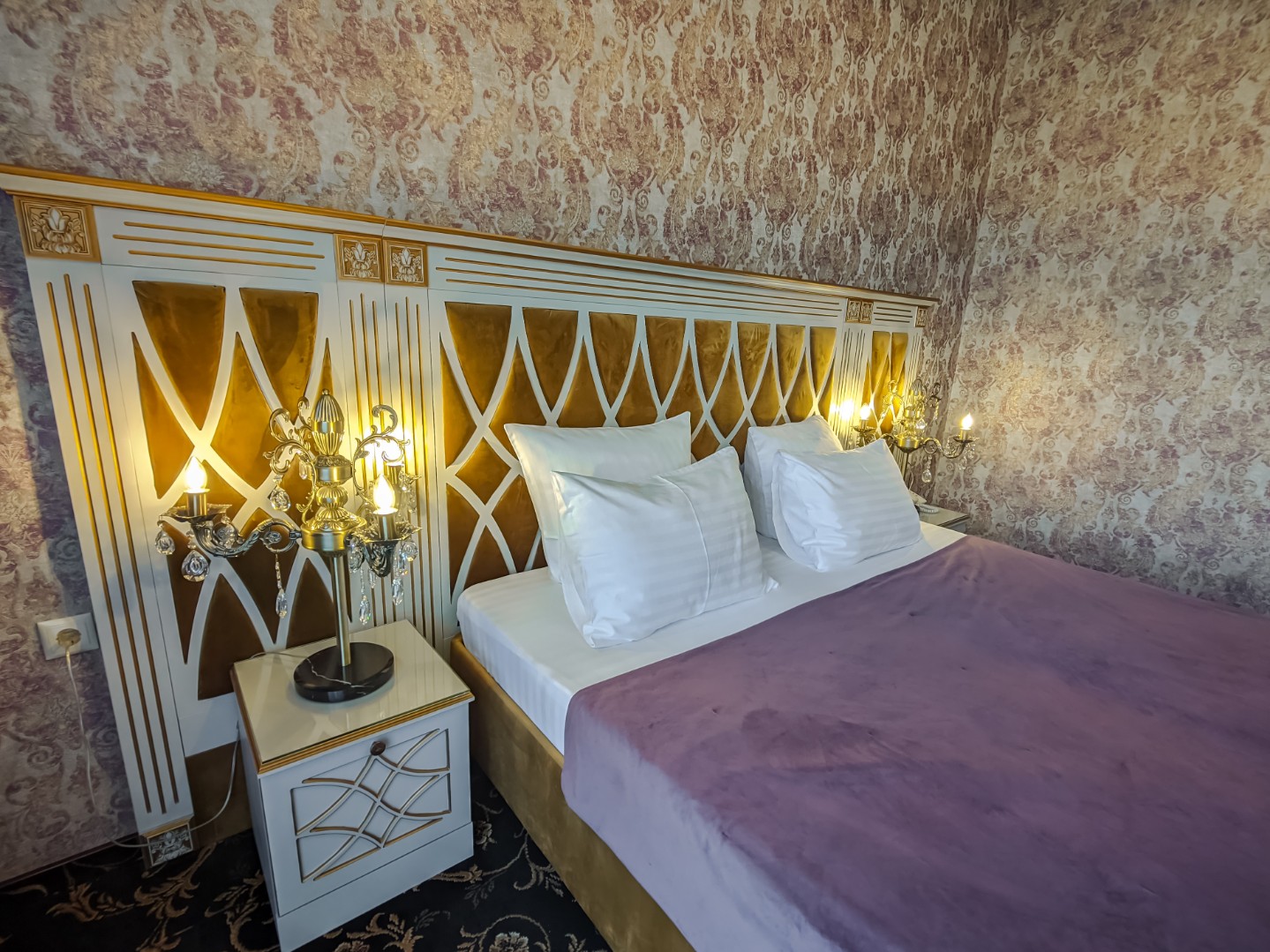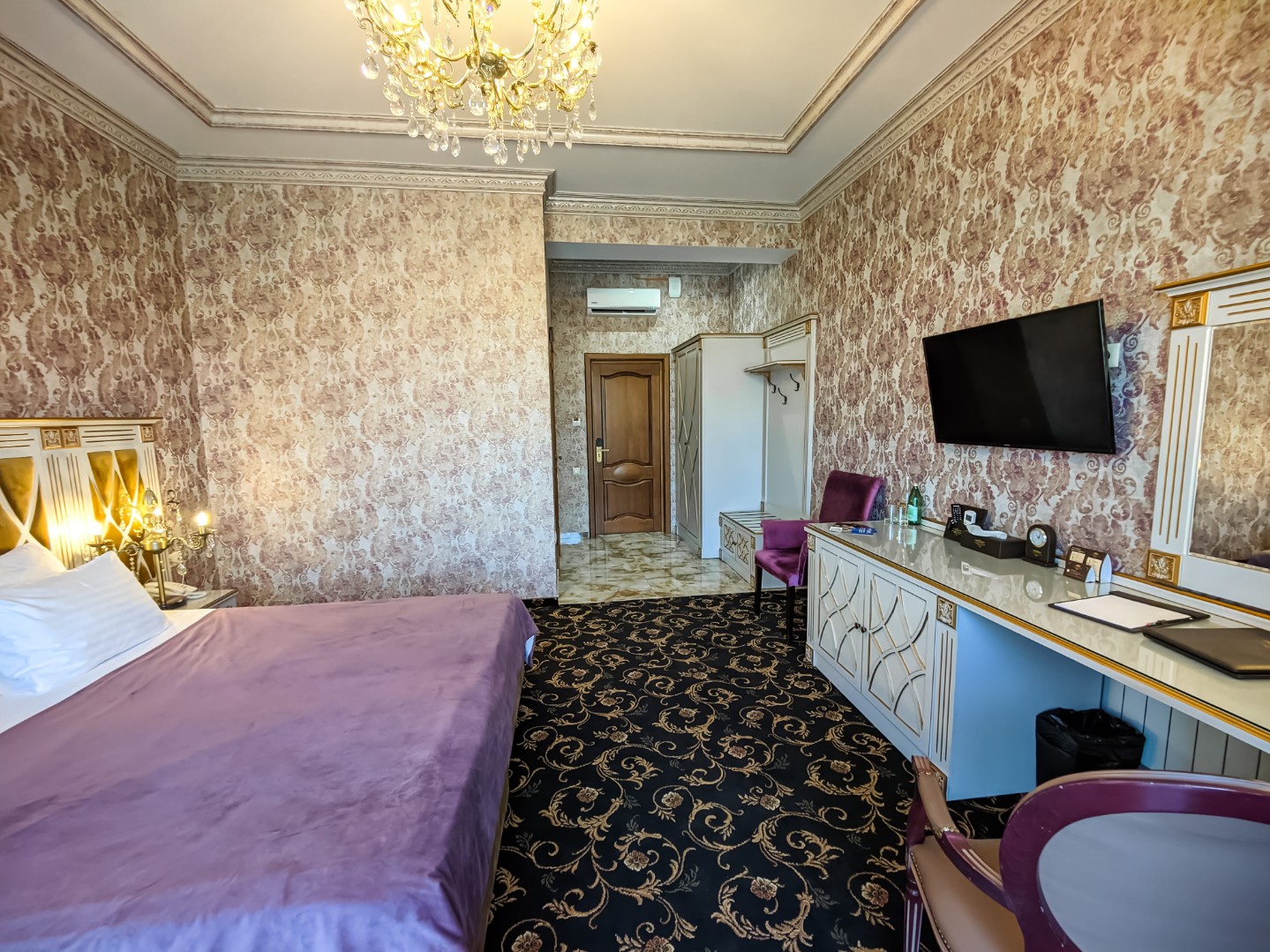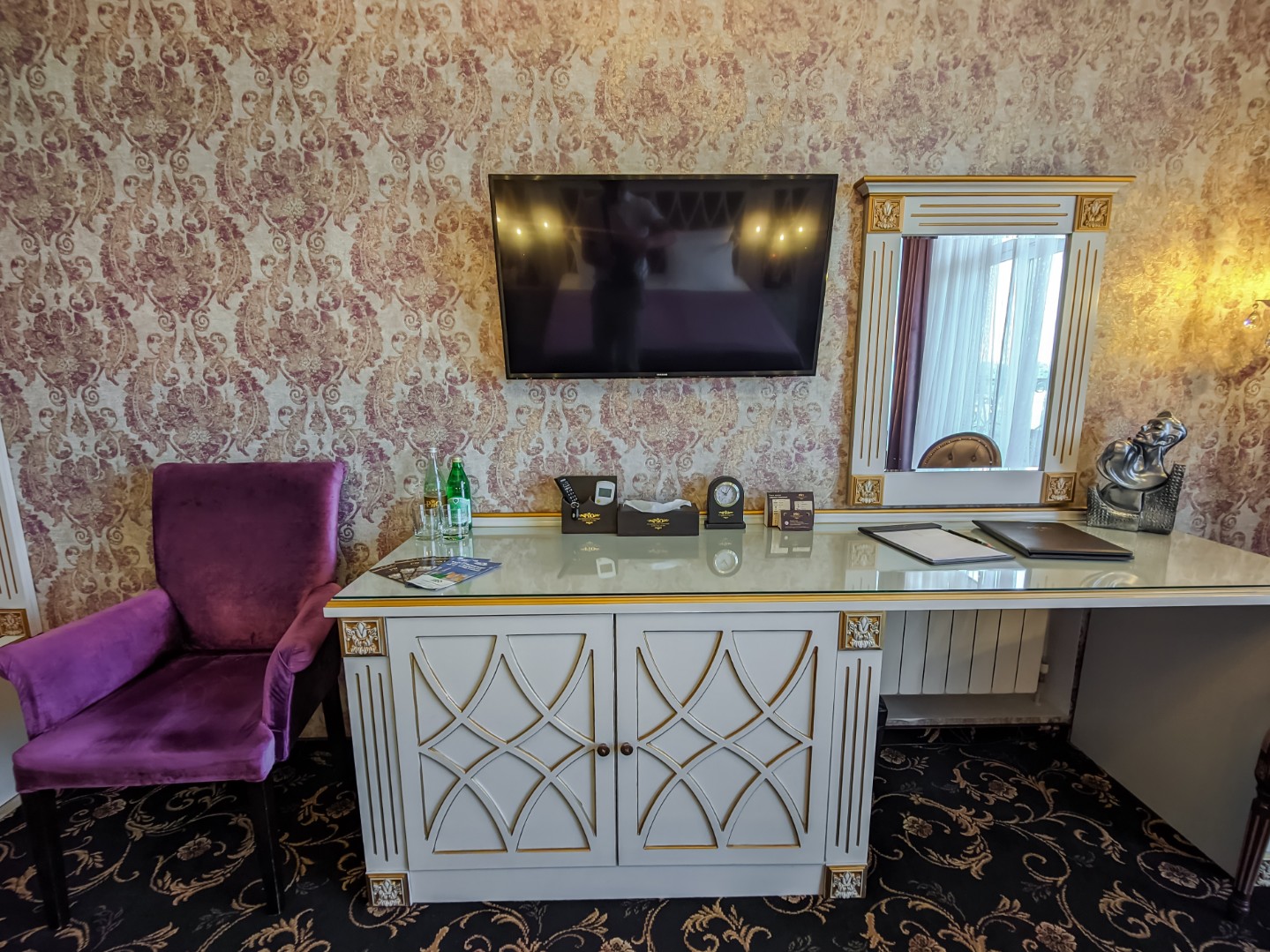 В номере: двуспальная кровать с размером «queen-size» с возможным разделением на 2 односпальные, прикроватные тумбы, светильники, торшер, туалетный столик и кресла, платяной шкаф, сейф, мини-бар, минеральная вода и вода без газа включенная в стоимость, кабельное ТВ, ЖК телевизор, Wi-Fi, кондиционер, необходимые принадлежности для ухода за верхней одеждой, гладильные принадлежности, балконы с прекрасным видом на футбольное поле и парковую зону, звукоизоляция.